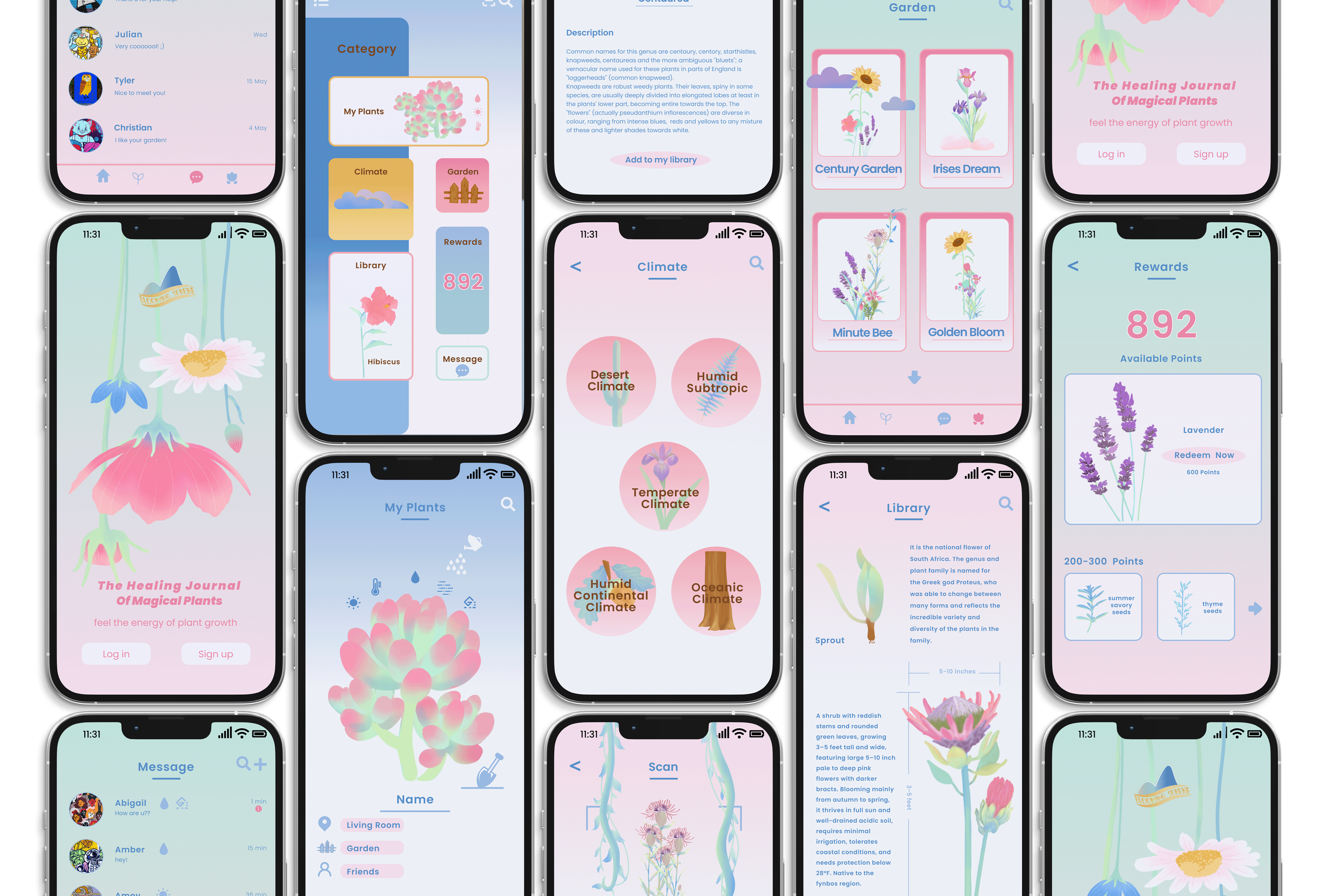 The system organizes content through climate categories, personal gardens, plant libraries, and reward mechanisms, forming a cohesive interface language. Hand-rendered botanical illustrations and typographic hierarchy guide navigation across screens, positioning design as a framework for comfort, engagement, and gradual growth.