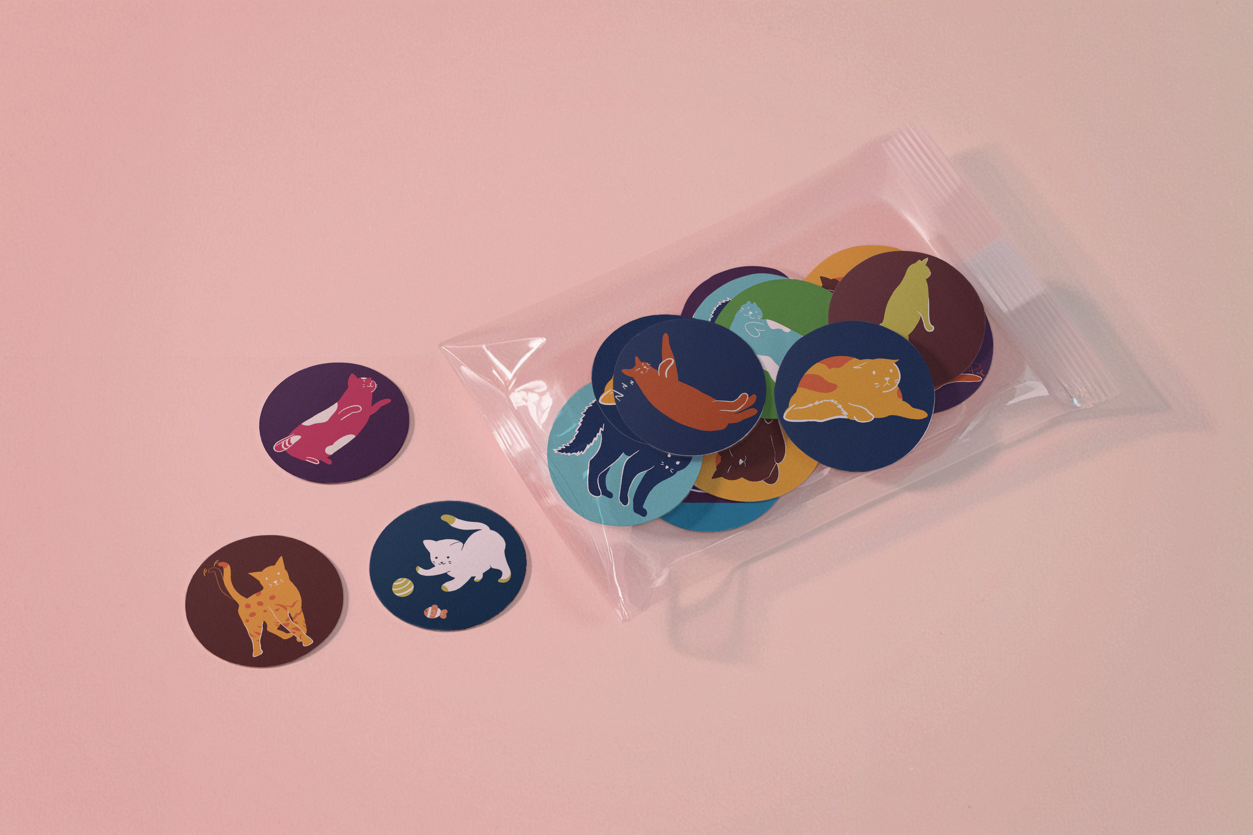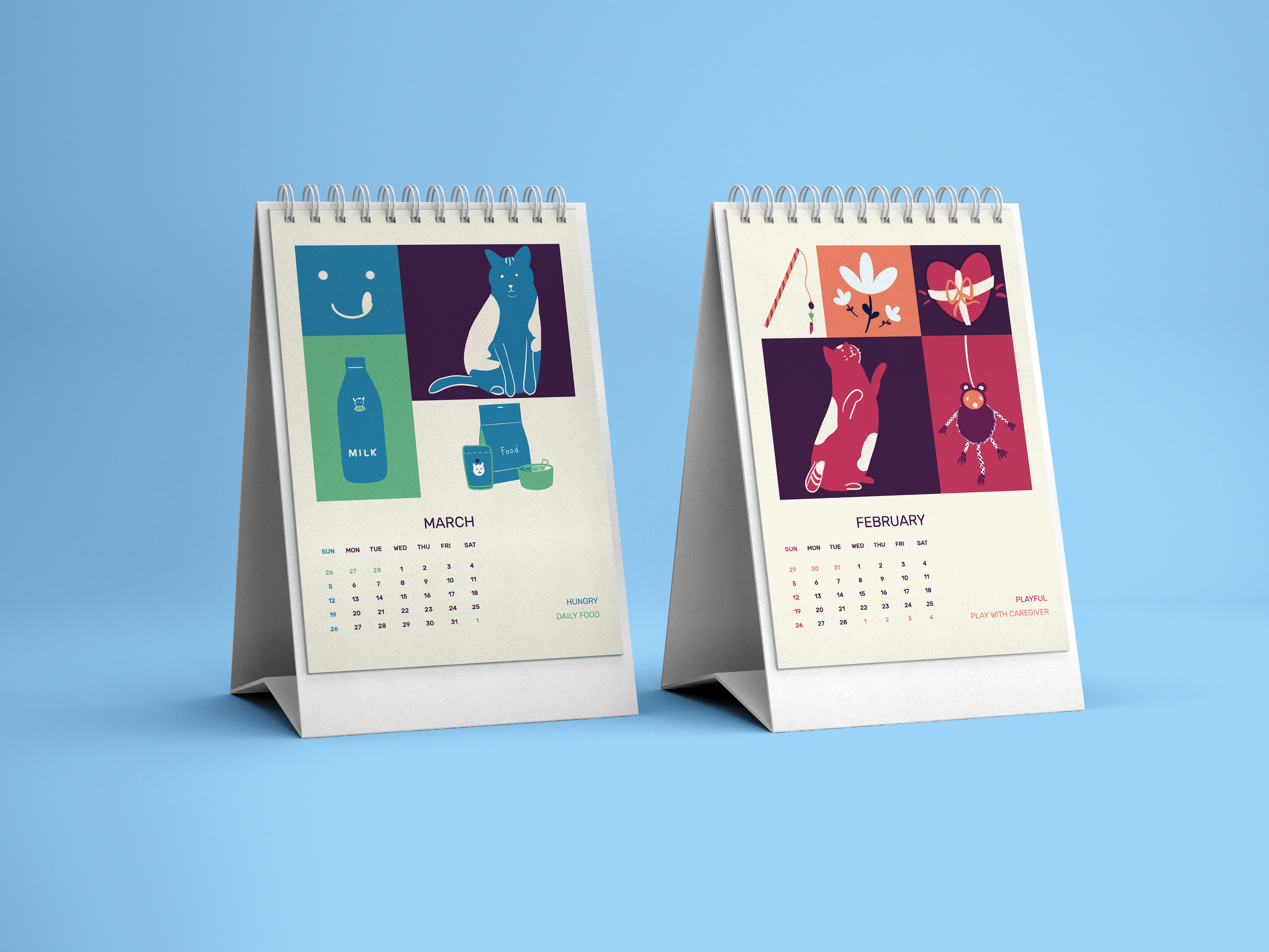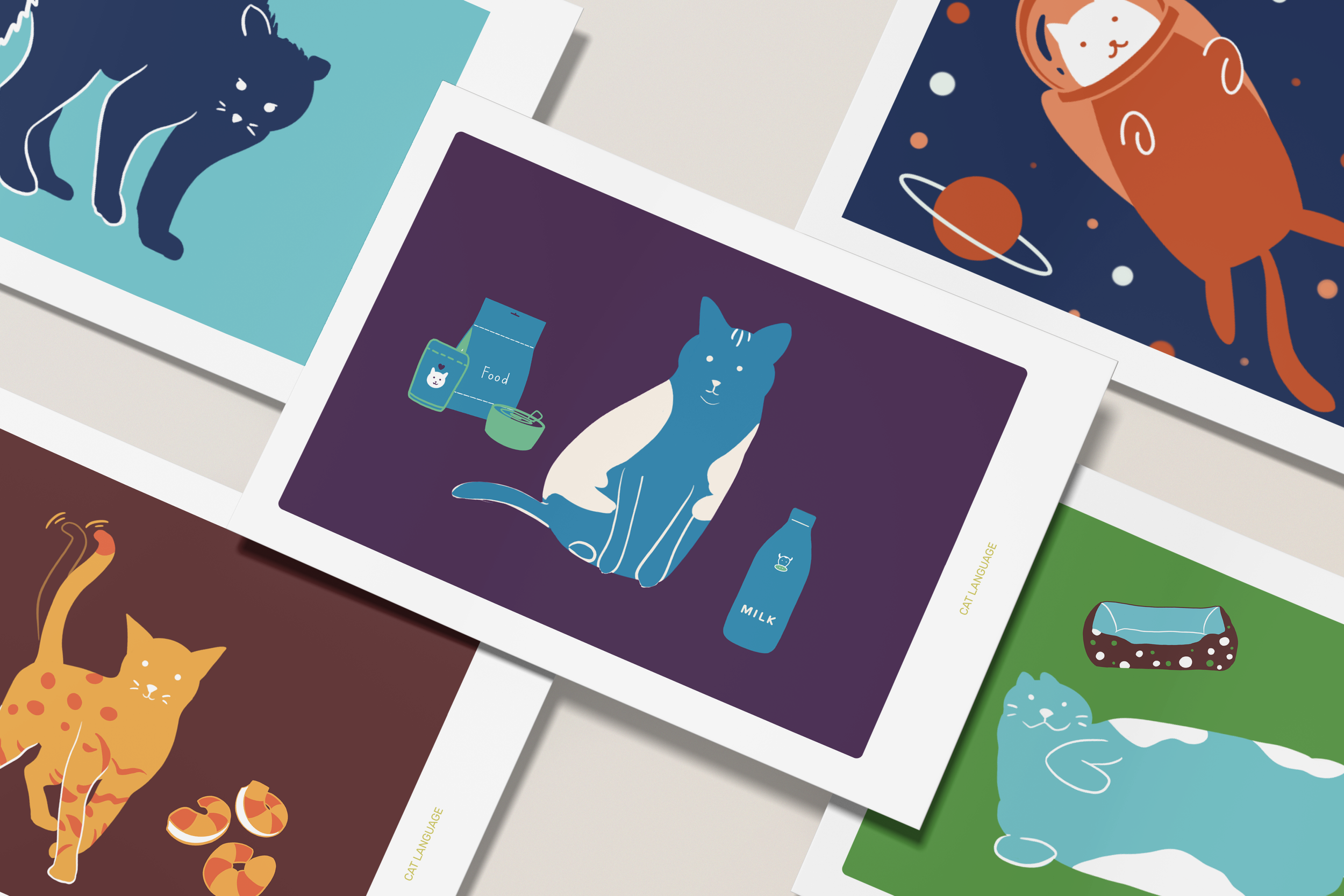 The visual language extends across multiple touchpoints, including a calendar, postcard set, and reusable tote bags. Through color coding, compositional rhythm, and modular illustration elements, the system builds a cohesive product line that translates feline emotion into a readable graphic language.